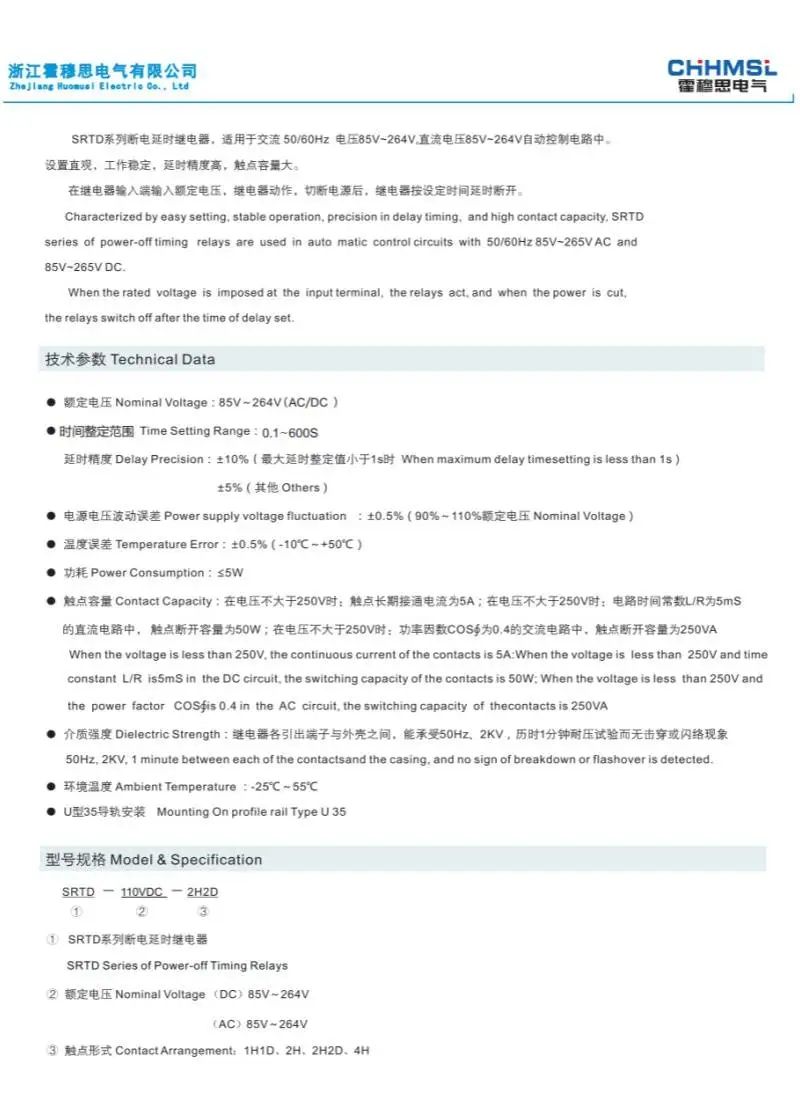 > 霍穆思断电延时时间继电器SRTD-220VDC-2H2D